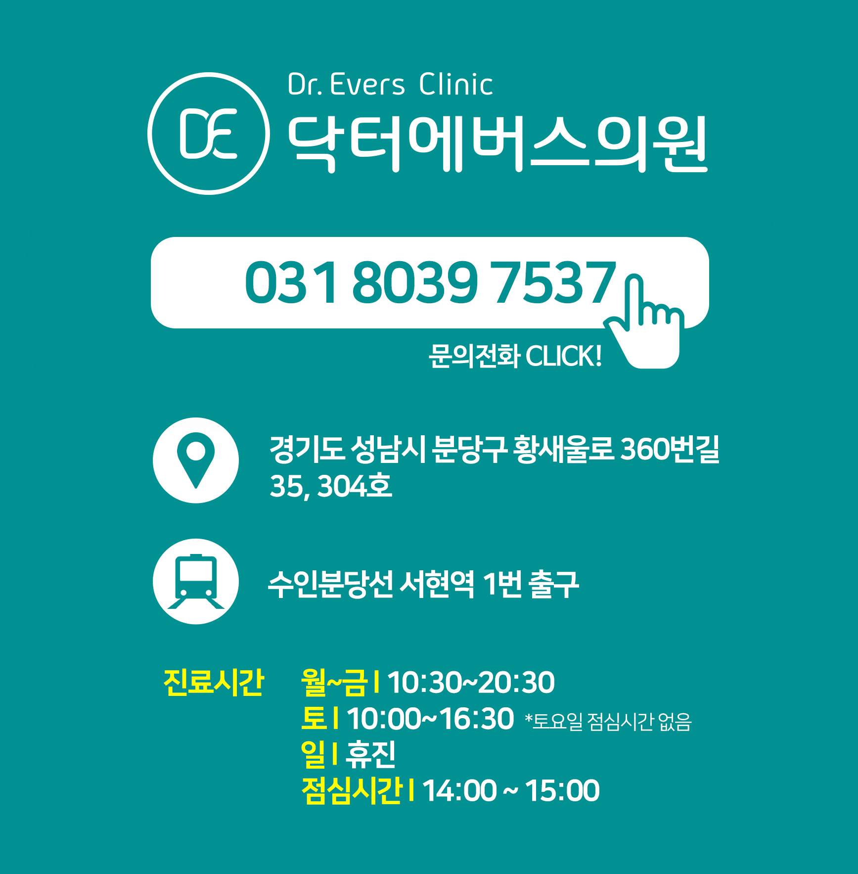 [ 진료시간 ]월~금 : 오전 10:30 - 오후 08:30토 : 오전 10:00 - 오후04:30 일 : 휴진*점심시간 오후 02:00 - 03:00*토요일은 점심시간이 없습니다.